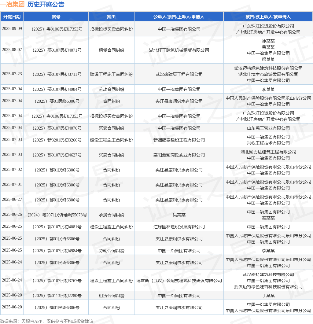 案号:(2025)鄂0113民初2280号审理法院:武汉市汉南区人民法院案由:租赁合同纠纷当事人信息: 原告/上诉人:中国一冶集团有限公司 被告/被上诉人:丁某某开庭日期:2025年6月20日根据统计,近一年内以中国一冶集团有限公司为当事人的历史开庭公告有724则,其中案由为“买卖合同纠纷”的公告以210则居首,其次为“建设工程分包合同纠纷”有96则,“建设工程施工合同纠纷”有92则。历史开庭公告(前20条)如下: